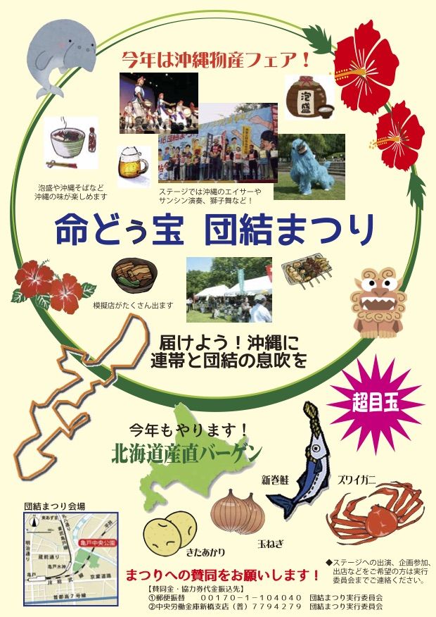 沖縄・辺野古に基地はいらない!をメインスローガンに、亀戸中央公園A地区での開催されます。